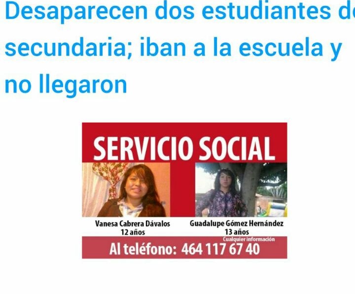 A cuatro días de su desaparición los padres y familiares de Guadalupe Gómez Hernández y Vanessa E. Cabrera Dávalos ambas de 13 años de edad, coincidieron en hacer un atento llamado a la población para que los apoye reportando cualquier tipo de dato que pudiera aportar a su localización.