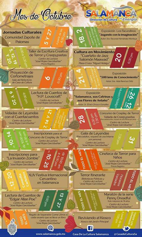 Salamanca, Gto. En este mes de octubre el Centro de Lectura “José Rojas Garcidueñas” impartirá una serie de talleres, muestras de cine y cursos de terror, alentando a los jóvenes y público en general a participar de lo que se vivirá en sus instalaciones, cuyo objetivo es promover la convivencia, el desenvolvimiento cultural y artístico.