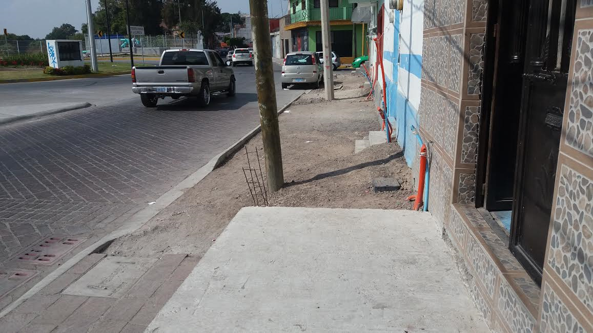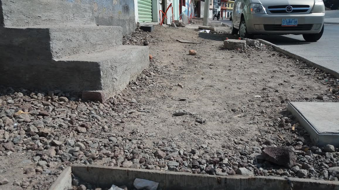 En la calle Allende casi esquina con Pasajero, se puede apreciar la banqueta que no ha sido terminada y que se encuentra con tierra, grava e incluso con algunos castillos que sobresalen unos 50 cms de la superficie, las mangueras también están expuestas y se encuentran sostenidas únicamente con piola para evitar estén en el suelo.