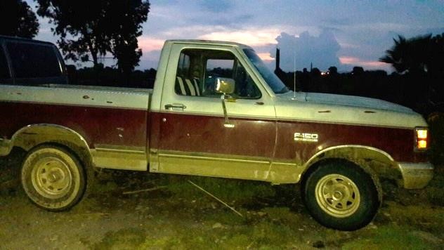 Camioneta marca Ford, F150, modelo 1991, color rojo/gris, sin placas de circulación, número de serie alterado.