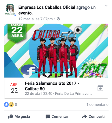 El mismo perfil de la red social el día de ayer, 12 de Marzo, anunció también la presentación confirmada de la agrupación norteña “Invasores de Nuevo León” que se estarán presentando el día 13 de Abril, etiquetando en la publicación a la «Empresa Los Caballos Oficial», perfil de Facebook que también el día de ayer 12 de Marzo publicó las presentaciones de los grupos mencionados y hoy 13 de Marzo por la tarde invito a seguir la página oficial «Feria de la Primavera Salamanca 2017».