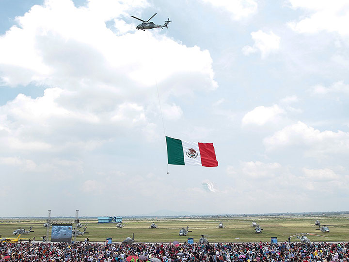 El mariachi y la banda tropical de la Secretaría de la Defensa Nacional (Sedena) amenizaron la espera, mientras la gente se tomaba «fotos pal feis» con los 18 aviones y helicópteros en exhibición estacionados a lo largo de la enorme pista de maniobras.