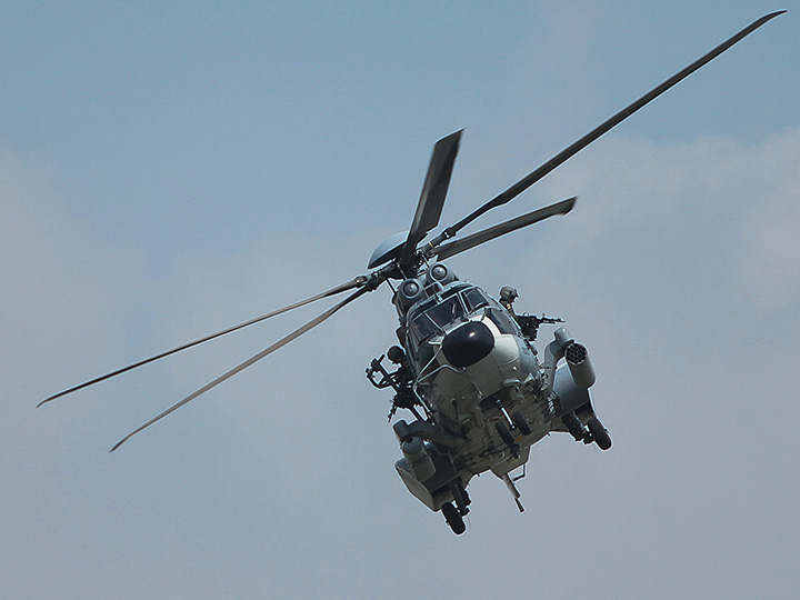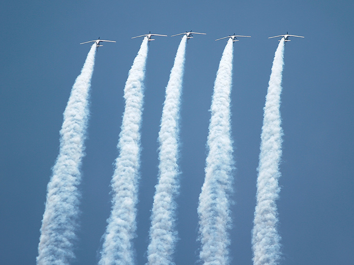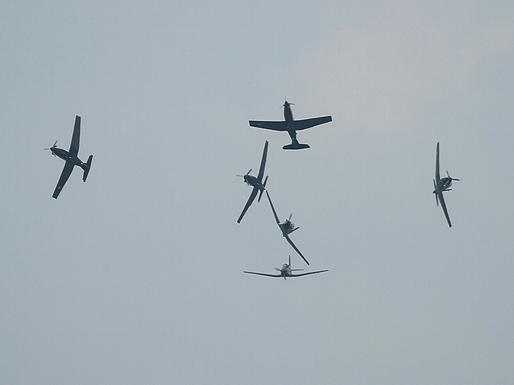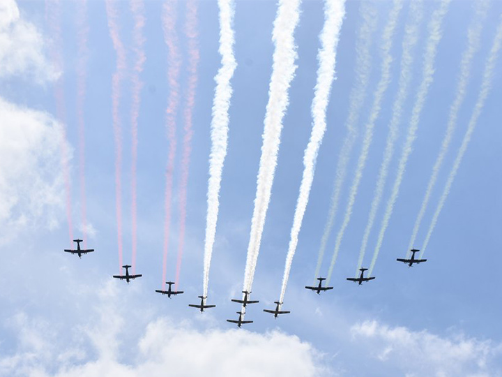 Aviones amarillos PT-17 soltaron papeles de colores; en parejas, coordinados, helicópteros MD530F y MI-17 simularon tiros y bombardeos.