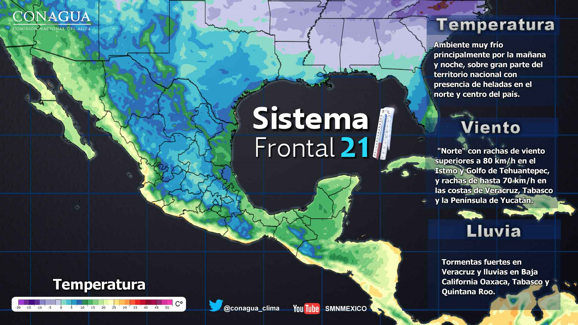 La masa de aire frío que impulsó al frente No. 21, el día martes modificará sus características térmicas, por lo que se prevé el incremento de la temperatura diurna en gran parte del territorio nacional, además de viento de componente norte con rachas de hasta 50 km/h en el Istmo y Golfo de Tehuantepec, intensidades que tenderán a disminuir al final del día.