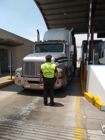 Los policías federales en el lugar asegurando un tractor camión Marca Dina, (Cabina de Kw) modelo 1992, color blanco, placas del SAF, acoplado a Semirremolque Tipo Jaula Marca Greser, Modelo 2003, color blanca, placa del SAF, Con Reporte de Robo al 911,en estado de abandono.