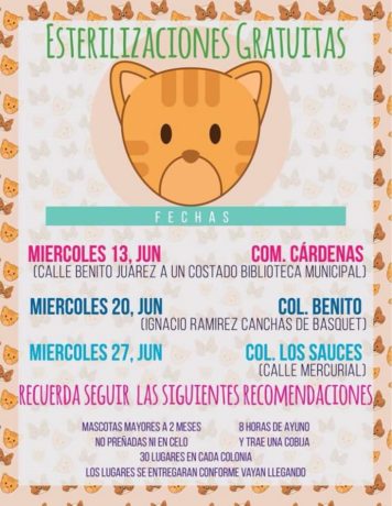 Por ello se continúan con la jornada de esterilización gratuita la cual se estará llevando a cabo el día miércoles 13 de junio en la comunidad de Cárdenas, en la calle Benito Juárez a un costado de la Biblioteca municipal; el miércoles 20 de junio en la colonia Benito Juárez en la calle Ignacio Ramírez dentro de las Canchas de Básquet; y el día miércoles 27 de junio en la colonia Los Sauces en la calle Mercurial.