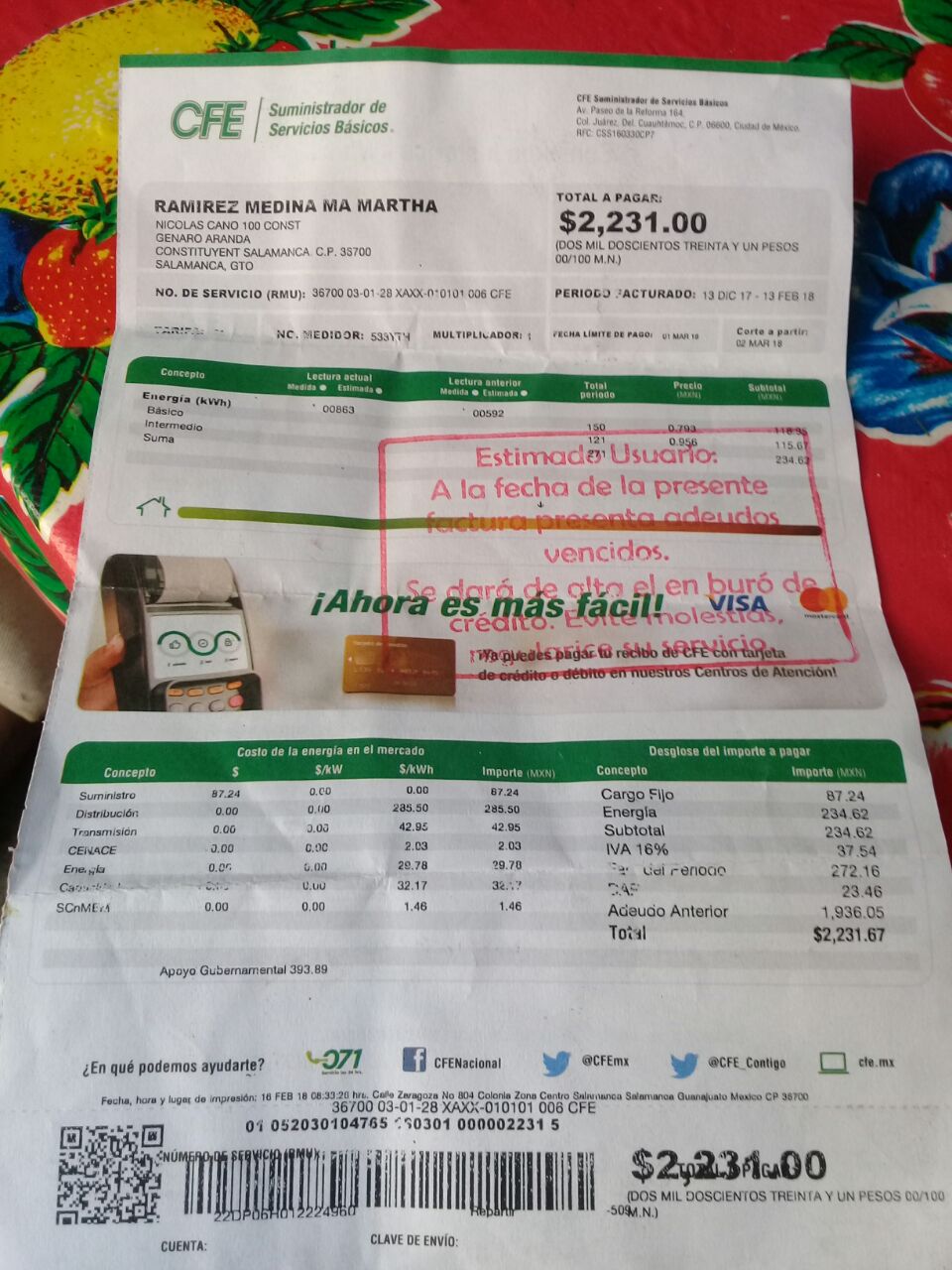 Dos meses después, la titular Ma. Martha Ramirez Medina cuando acudio a solicitar una explicación por una cantidad excesiva estipulada en el recibo de cobro por consumo de energía correspondiente al periodo del 13 de diciembre de 2017 al 13 de febrero del 2018 con fecha limite de pago al 2 de febrero, donde se le informaba tenia que pagar un monto total de $ 2,231.00.