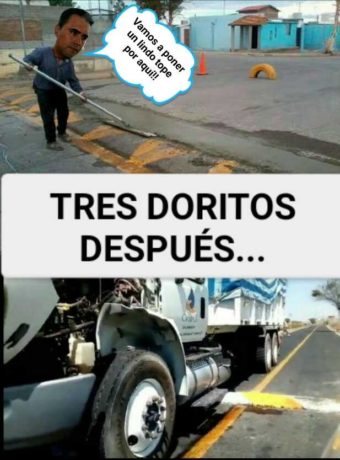 GRANDIOSA IDEA… Fue la de poner topes que más bien parecen bardas allá para la comunidad de Santiaguillo de García, y es que esas tochadas han ocasionado más problemas que beneficios, y es que no solo es la instalación del tope sino lo mal hecho del mismo, el cual daña camiones, si eso le hizo al camión que no le hará a un simple vehículo, la verdad es que cada día me sorprende más y más como la administración que encabeza el Presi Arredondo sigue empecinada en hacer las cosas mal y rete mal.
