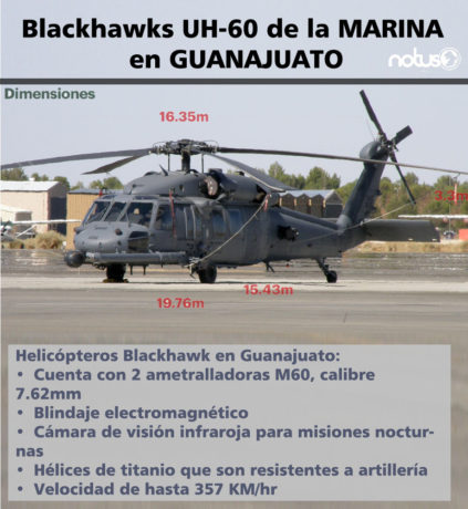 De acuerdo con la información publicada en el portal de noticias notus.com , un helicóptero Black Hawk UH-60 de la MARINA desde haca ya una semabs comenzó a sobrevolar en Guanajuato, esto como parte de la inclusión militar de un cuerpo de élite que se encargará de “aniquilar” a objetivos humanos que presuntamente trabajan para el crimen organizado en los municipios del corredor industrial de la entidad