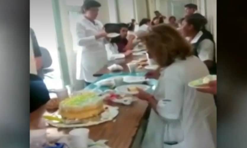 En el video se aprecian a trabajadores aún con la bata blanca puesta, celebrando y comiendo, mientras que una cantidad importante de pacientes estaba en espera de la atención.