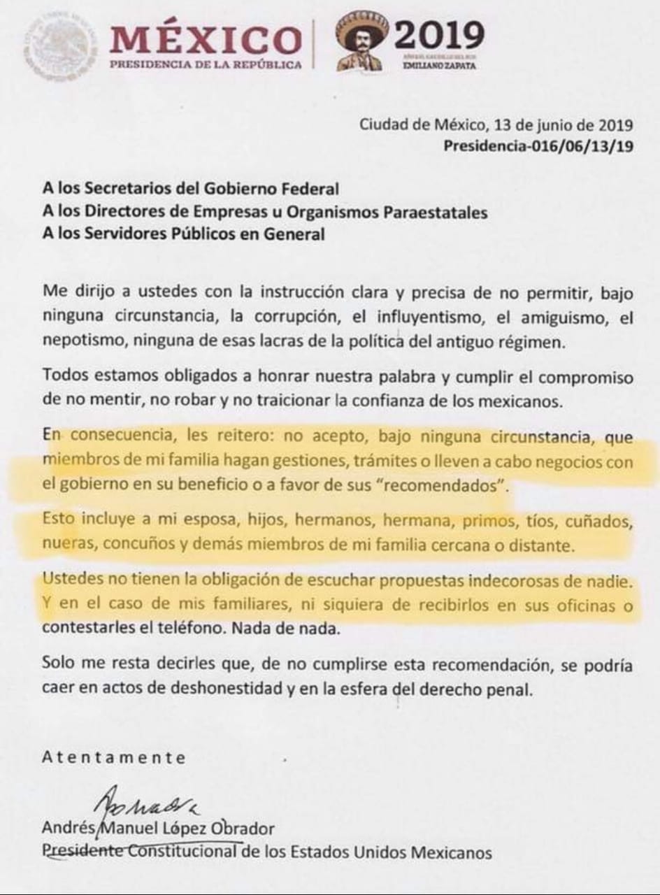 En el escrito, AMLO solicitó a los funcionarios abstenerse de hacer cualquier acto de corrupción o ‘amiguismo’, permitiendo que se realicen acuerdos en nombre de familiares o conocidos, debido a que estarán realizando ‘alguna de las lacras de la política del antiguo régimen’.