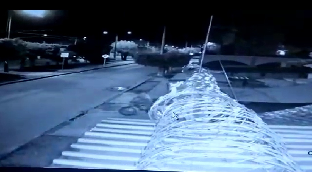 En el video se observa que dos hombre en bicicleta llegan al domicilio a las 10:57 de la noche y voltean a su alrededor para identificar que no haya personas cercanas e inmediatamente uno de ellos se acerca a la pared y se ve cómo jala la cámara con un palo y un alambre y al momento de bajar el aparato, uno de los delincuentes sonríe para la cámara lo que afectados calificaron como burlesco.