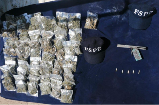 Al ir corriendo, el sujeto arrojó una bolsa de plástico en cuyo interior se localizaron 60 bolsas de plástico con una hierba verde y seca, con las características de la mariguana, así como un arma de fabricación casera y cinco cartuchos útiles.