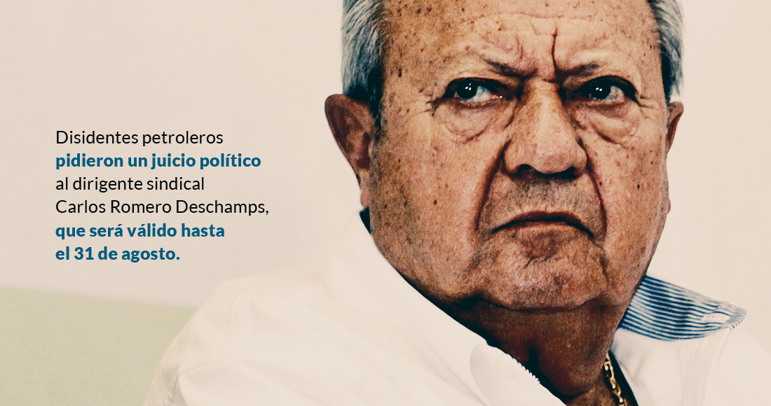 Petrolerosdisidentes de Veracruz exigieron a la Cámara de Diputados iniciar de manera inmediata un juicio políticocontra Carlos Romero Deschamps, Secretario General del Sindicato de Trabajadores Petroleros de la República Mexicana (STPRM), ya que la petición está pendiente y sólo será válida hasta el próximo 31 de agosto.