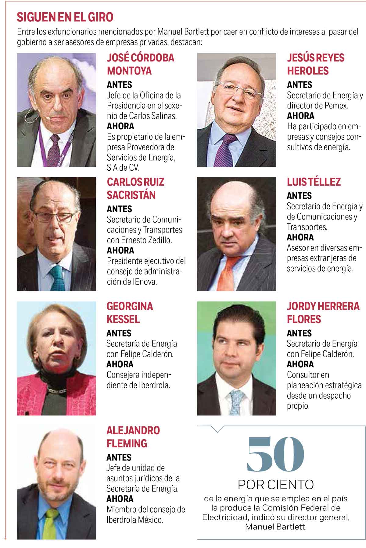 De acuerdo con Manuel Bartlett, titular de la Comisión Federal de Electricidad (CFE), la lista de exfuncionarios que cayeron en conflicto de intereses y lucraron con la información que sabían del sector energético mexicano la componen desde exjefes de la oficina de la Presidencia hasta extitulares de la propia Comisión Federal de Electricidad.
