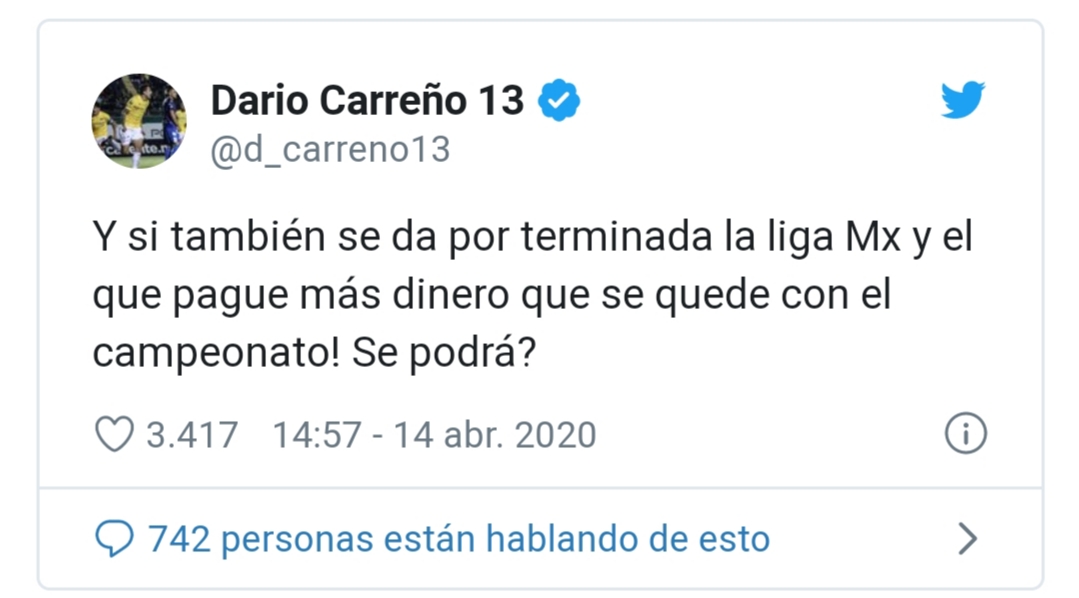 Luego de que se confirmara la cancelación del Clausura 2020 del Ascenso MX, Darío Carreño, jugador de Venados de Yucatán mostró su molestia en redes sociales con dicho suceso, pues aseguró que entonces también deberían de dar por terminado el torneo de la Liga MX y dárselo al equipo que pague más.