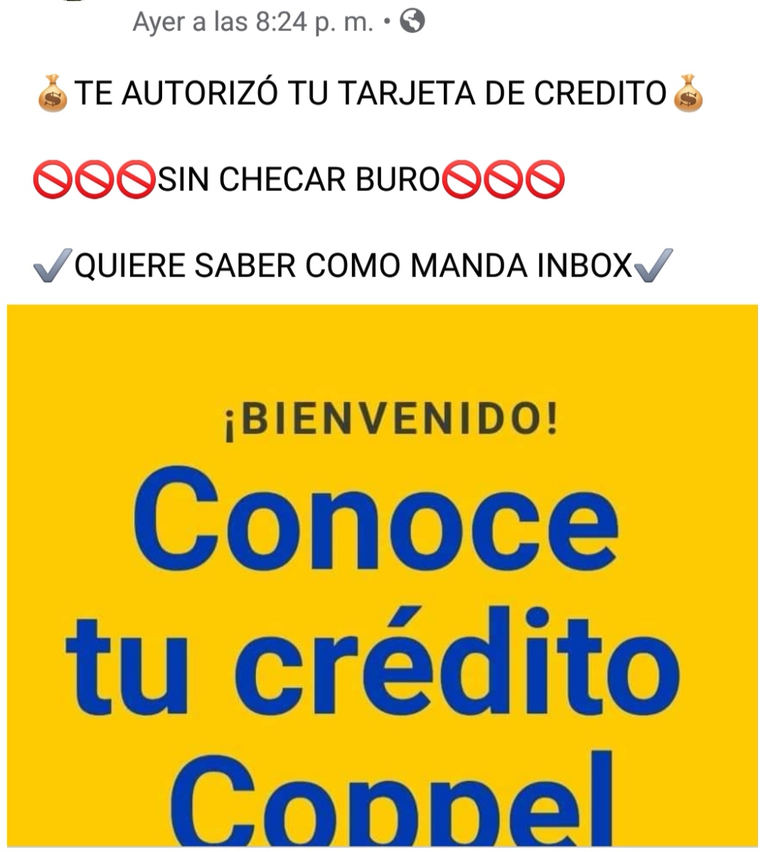 Seguidores de El Salmantino alertaron que a través de redes sociales un grupo de personas que se hacen pasar por ejecutivos de Bancoppel ofrecen créditos bancarios por 25 mil pesos y les piden dinero para realizar el trámite prometiéndoles la entrega inmediata de una tarjeta de esa institución financiera, luego solicitan un pago para poder tramitar la tarjeta y al asistir a la sucursal resulta que el supuesto empleado ni siquiera trabaja ahí.