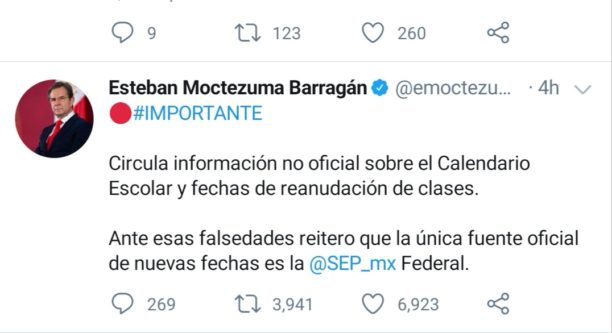 “Circula información no oficial sobre el Calendario Escolar y fechas de reanudación de clases”, publicó en Twitter.