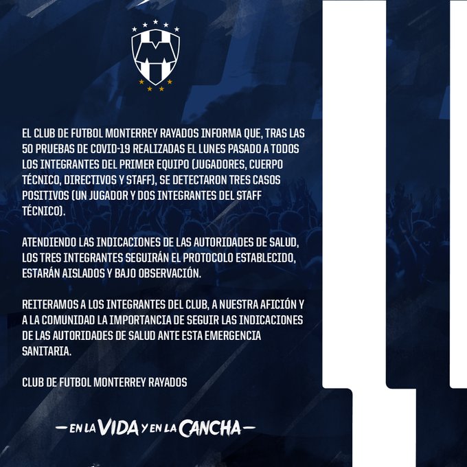 Monterrey informa que tras las 50 pruebas de Coronavirus realizadas a todos los integrantes del primer equipo, directivos y staff, se detectaron tres casos, los integrantes seguirán el protocolo establecido y estarán aislados y bajo observación», se lee en un comunicado colgado en redes sociales.