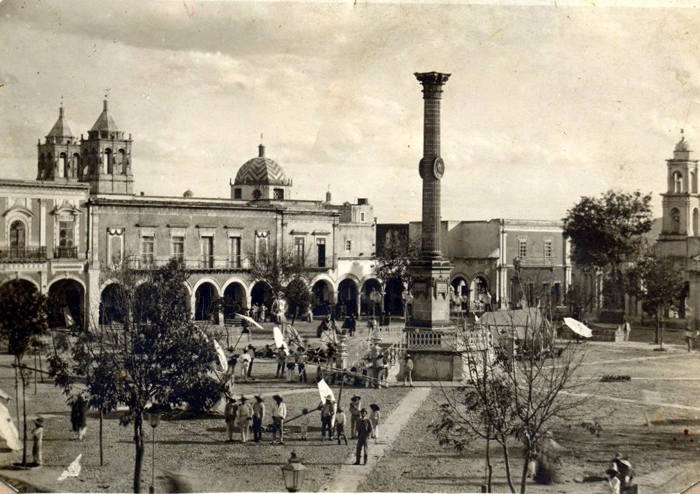 En esta toma hecha en la década de los años veinte desde la torre de la Parroquia Antigua aparece, en primer término el templo del Señor del Hospital que me da la sensación de que aun no estaba concluido, al fondo el templo de San Agustín y del lado izquierdo sobresale entre los ya crecidos árboles de trueno, el Kisoco del Centenario. Nótese el tendido de las vías del tranvía sobre la calle de Allende.
