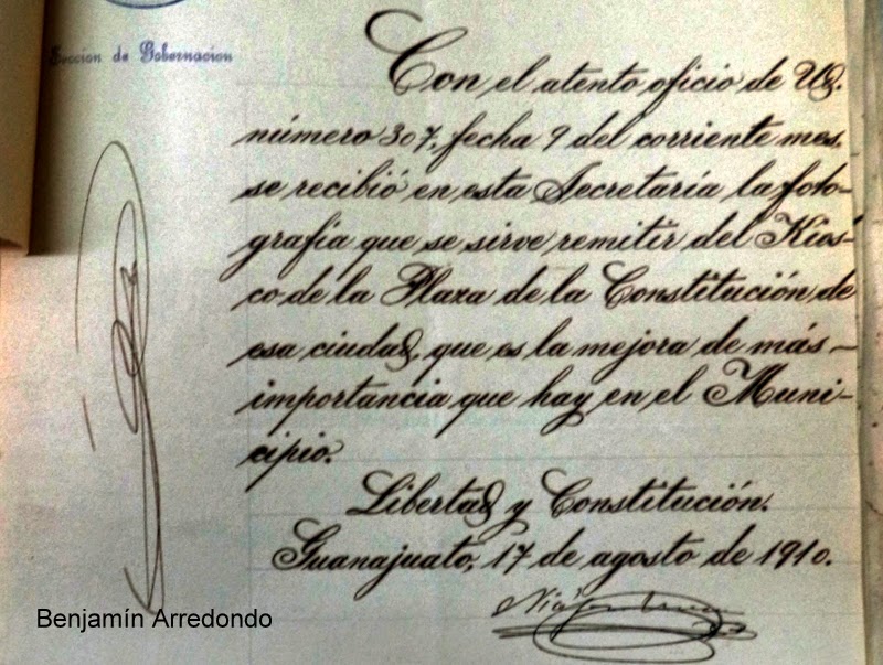 Recibí la Circular Número 2110 que, con fecha 14 de Febrero próximo pasado, se sirvió usted dirigirme, haciendo allí referencia al acuerdo de la Comisión Nacional del Centenario de la Independencia, relativo a la publicación de una Colección de Fotograbados de las mejoras que se hayan de inaugurar el próximo mes de Septiembre, en solemnidad del Glorioso Centenario de nuestra Independencia; y tengo la honra de contestar el precitado oficio; diciendo que el I. Ayuntamiento de esta ciudad ha contratado con la Casa de Jorge Unna y Cía. -San Luis Potosí- en 2,300$ un kiosco que se colocará en el centro de la Plaza.
