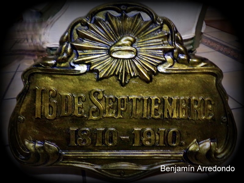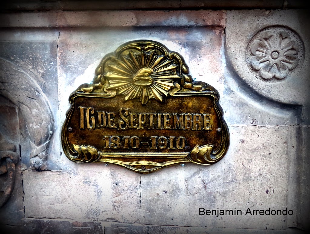 En este acercamiento vemos que las señoritas flanquean la placa que fue colocada para marcar el singular evento, cuando en Salamanca se conmemoró, oficialmente, el Centenario de la Independencia, para ello, también de la Casa Unna de San Luis Potosí, fue enviada, por orden del Gobierno del Estado de Guanajuato una placa metálica con la leyenda «16 de Septiembre 1810-1910» que fue colocada en el Kiosco, eso lo podemos ver claramente en esta estupenda toma.