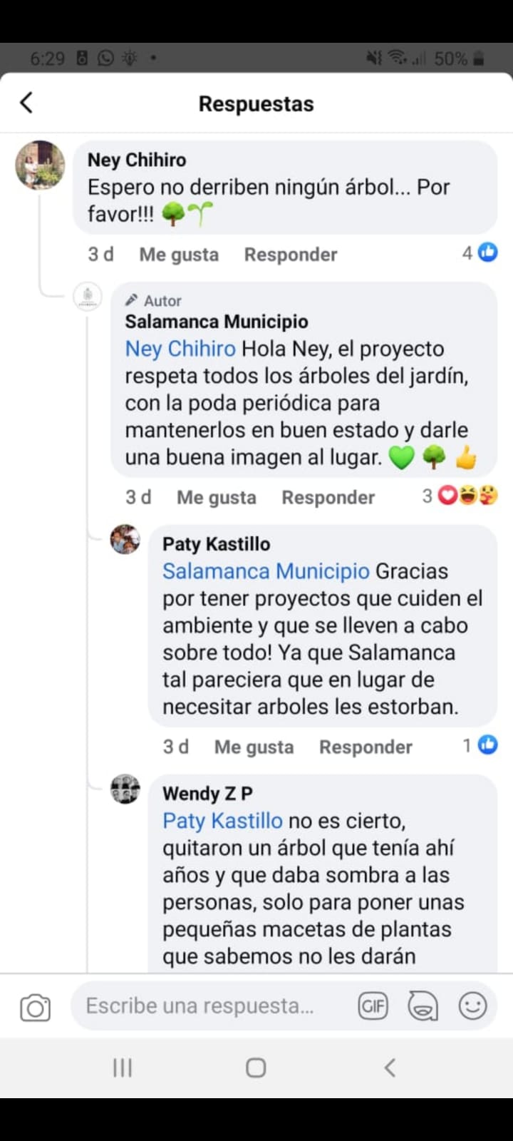 Beatriz Hernández junto con su equipo de trabajo prometieron a los ambientalistas que ningu árbol había sido talado en la remodelacion del jardín xidoo lo cual fue una mentira pues el pasado 9 de septiembre se inauguró este parque remodelado y al día siguiente fue el 3er y último informe de la alcaldesa, la anterior estructura del jardín consistía en que eran alrededor de 3 a 4 árboles por hilera lo cual hoy en día ya no existe pues talaron 3 árboles así como también removieron la estructura de cemento donde la gente podía tomar asiento, el más grande logró en la administración de Beatriz ha sido remodelar este jardín pero al costo de mentir a los ambientalistas y talar árboles que en su totalidad son pocos en el municipio, pues ahora son menos cabe recordar que administraciones pasadas ya habían talado con muchos árboles que daban sombra a los salmantinos como es el caso de la plazoleta Hidalgo y la calle comunicación norte por citar algunos ejemplos pues ahora el tan presumido jardín xidoo se une a estos lugares que han sufrido tala de árboles.