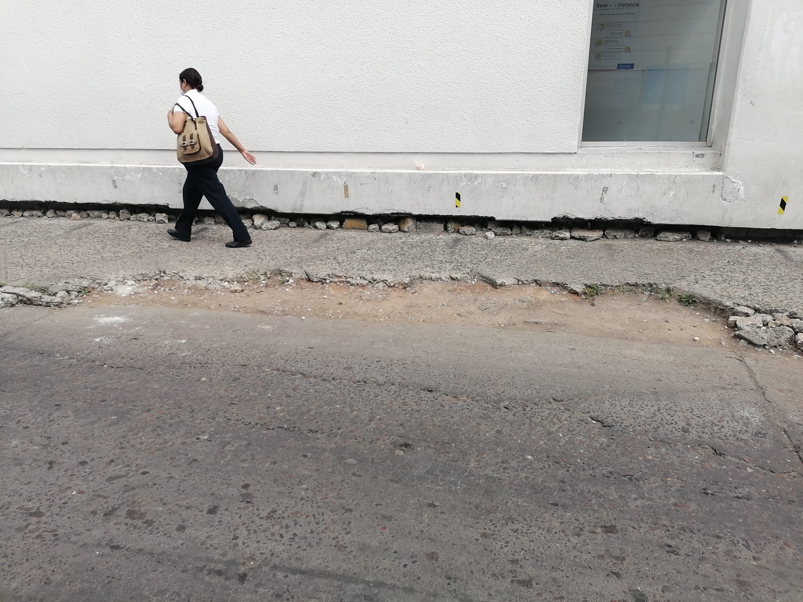 El paso de los transeúntes ahora fue reducido a un solo carril ya que la mitad de la banqueta en el tramo de reconocido banco nacional ha sido destruida a la mitad y en su contra esquina ya también comienza a pasar esto mismo.