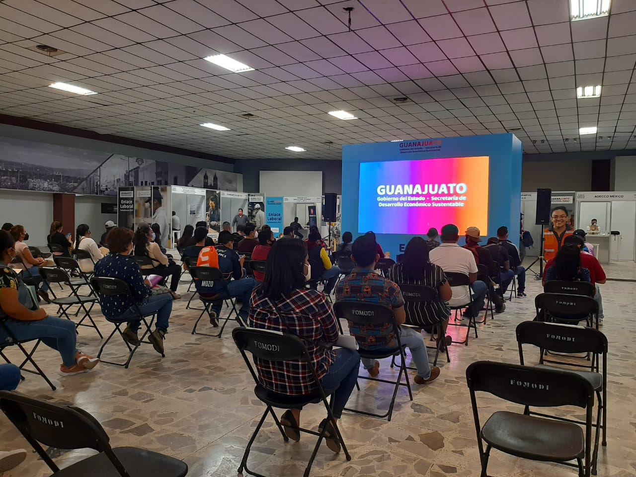 Interesados en conseguir empleo acudieron al Centro Cívico para beneficiarse del programa “Enlace Laboral” y en una larga espera, los ciudadanos observan en pantallas los supuestos logros que presume el Estado, intentando convencer a los asistentes de que si votan por el PAN van a tener un empleo digno y con los beneficios que cualquier trabajador anhela.