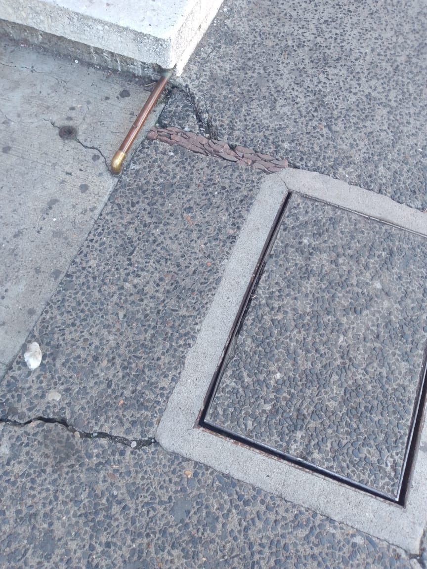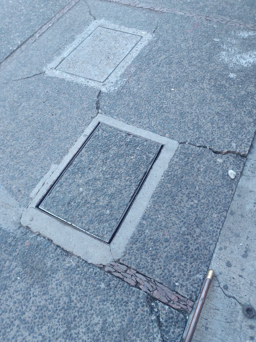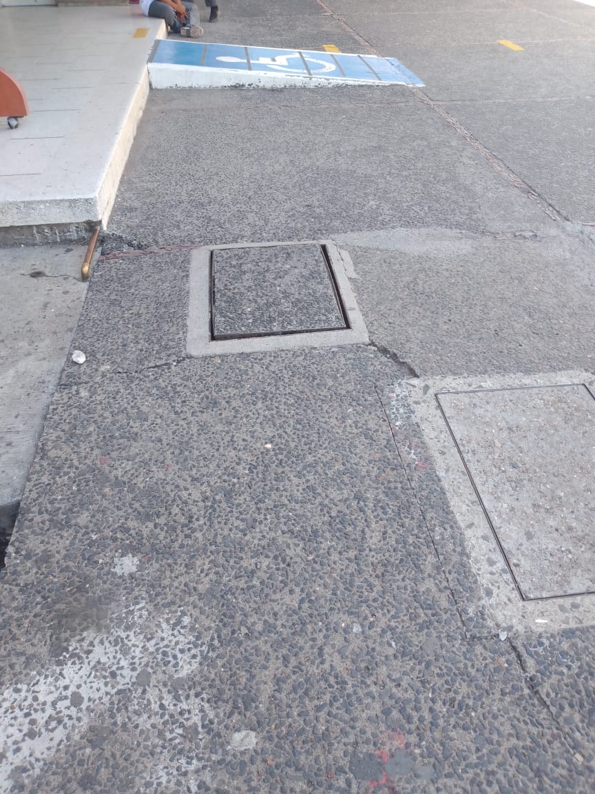 A través de una denuncia ciudadana, derechohabiente del Instituto Mexicano del Seguro Social (IMSS) reporta la tapa de un registro localizado justo en el acceso principal, el cual se encuentra levantado y provocó su caída, causándole golpes y un esguince cervical.