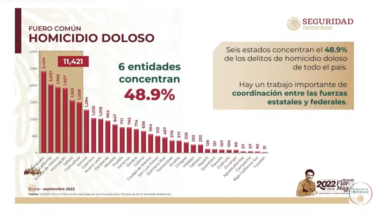 Guanajuato encabeza la lista de los Estados más violentos y, junto con Baja California, Estado de México, Michoacán, Jalisco y Chihuahua concentran un total de 11 mil 421 homicidios dolosos, lo que representa el 48.9% de este delito en el país.