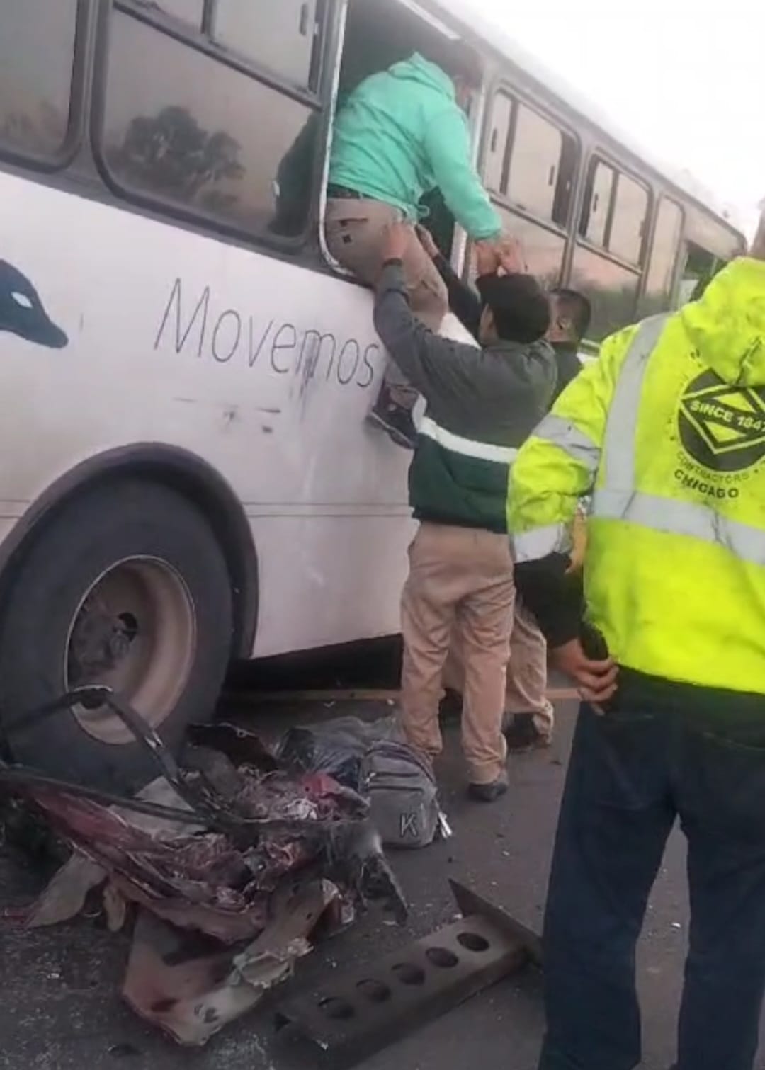 Sobre la carretera quedaron trozos metálicos y de plástico, mientras los cuerpos de rescate auxiliaban a los pasajeros de la unidad de transporte para hacerlos descender a través de una de las ventanas.