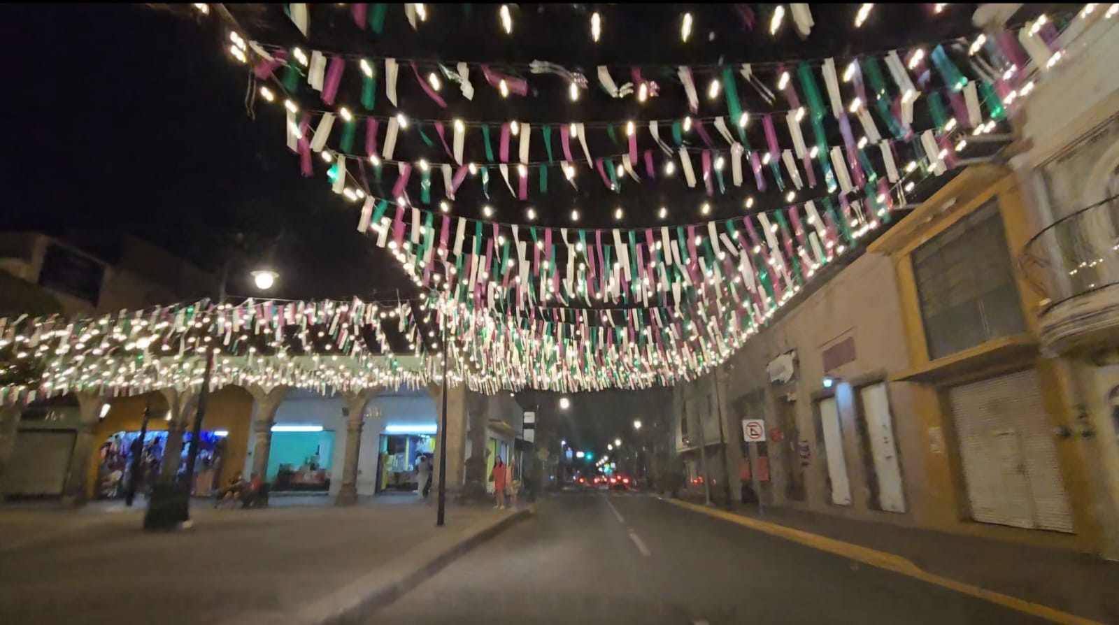 Las luces amarillas instaladas en diversos puntos bañan los edificios históricos, tal es el caso del patio central de la Casa de la Cultura creando un ambiente acogedor, de igual forma se han instalados listones en colores, blanco, violeta y verde, lo que genera un ambiente festivo.