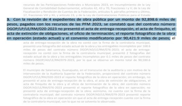 De acuerdo con la Auditoría de Cumplimiento 2023-D-11027-19-1058-2024, se realizó un procedimiento de fiscalización correspondiente al año 2023 de las participaciones federales que recibió el municipio de Salamanca, Guanajuato, en la que se revisó que los procedimientos de contratación de obra pública se apegaran con la normatividad local aplicable, lo cual no fue cumplido por el presidente César Prieto, pues se detectaron graves omisiones que ponen en duda la transparencia, contratación y ejecución del puente elevado de la Avenida Héroes de Cananea.