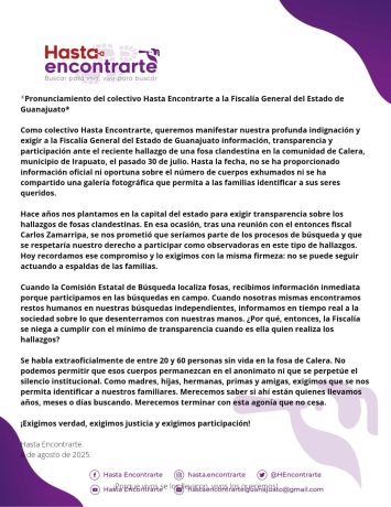De manera simultánea, en la comunidad La Calera de Irapuato, surgía otra escena de horror. A través de un proceso de investigación por desaparición forzada, la Fiscalía General del Estado ingresó a una finca donde se descubrieron restos humanos enterrados clandestinamente. Sin embargo, durante cinco días, las autoridades mantuvieron silencio, fue la presión del colectivo de búsqueda Hasta Encontrarte la que obligó a la Fiscalía a informar públicamente que se habían recuperado restos de 32 personas, aunque solo 15 habían sido identificadas. El colectivo denunció que esta forma de operar es un retorno a las prácticas opacas que caracterizaron la administración del exfiscal Carlos Zamarripa.