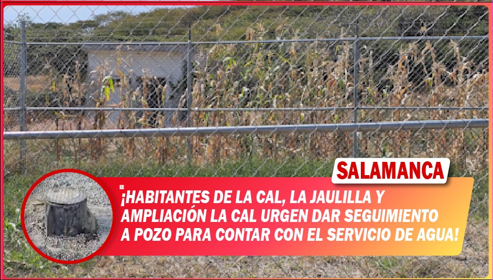 Una nueva queja de salmantinos que se sienten olvidados por la Administración Municipal de Salamanca surge con respecto a la creación de un pozo que abastecería de agua a las comunidades de La Cal, La Jaulilla y Ampliación La Cal; sin embargo, a cuatro años de gobierno de César Prieto, este no ha llegado, al menos no se encuentra en servicio ya que la construcción del Pozo se realizó en febrero de 2024.