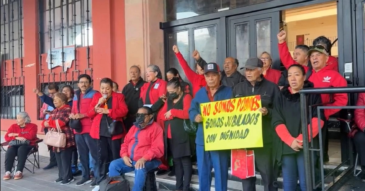 De acuerdo con sus consignas, los jubilados y pensionados exigen a las autoridades municipales el pago de sus prestaciones, mismas que aseguran, tienen tiempo sin percibir y las autoridades no les dan soluciones.