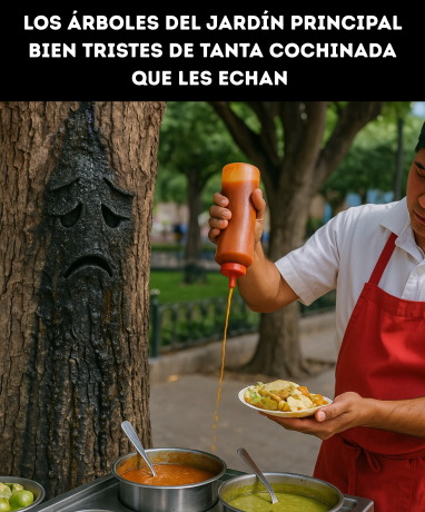 LOS ÁRBOLES SE NOS ESTÁN MURIENDO, COMPAS…Pos resulta que en el Jardín Principal los comerciantes andan aventando cochambre, aceites y demás mugreros en los árboles. ¡Ora pues! Si ya sabían que son pulmoncitos del centro, ¿pa’ qué los están matando así? El Presi César ya dijo que se van a tomar medidas, y que si no obedecen, los comerciantes pueden irse despidiendo de su lugar.