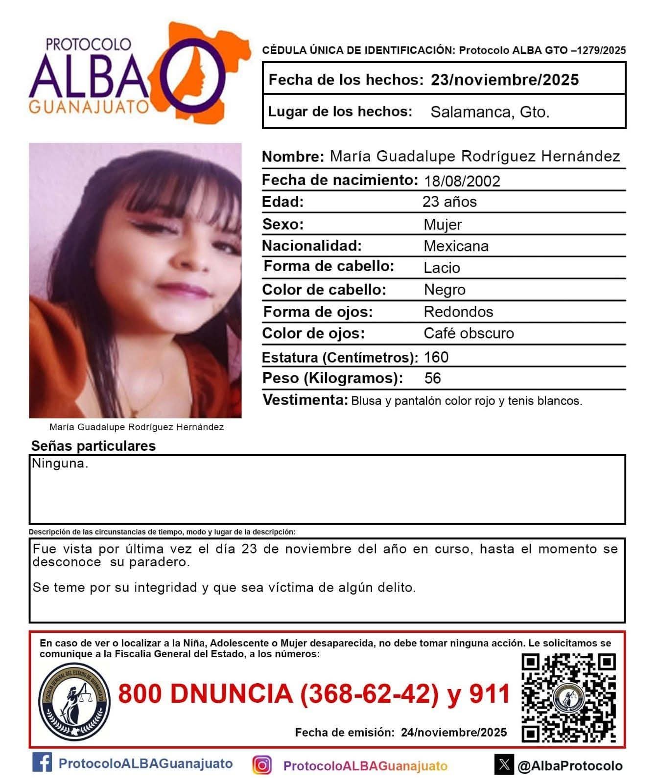 El tercer caso es el de María Guadalupe Rodríguez Hernández, una joven de 23 años que fue vista por última vez el domingo 23 de noviembre, alrededor de las cuatro de la tarde. Vestía un conjunto rojo con rayas blancas a los lados. Desde entonces, nada se sabe de ella.