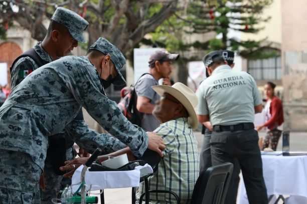 Efectivos de la Guardia Nacional brindaron proximidad y servicio en el Jardín Principal de Salamanca, Guanajuato, ofreciendo atención médica básica y cortes de cabello gratuitos a la población.