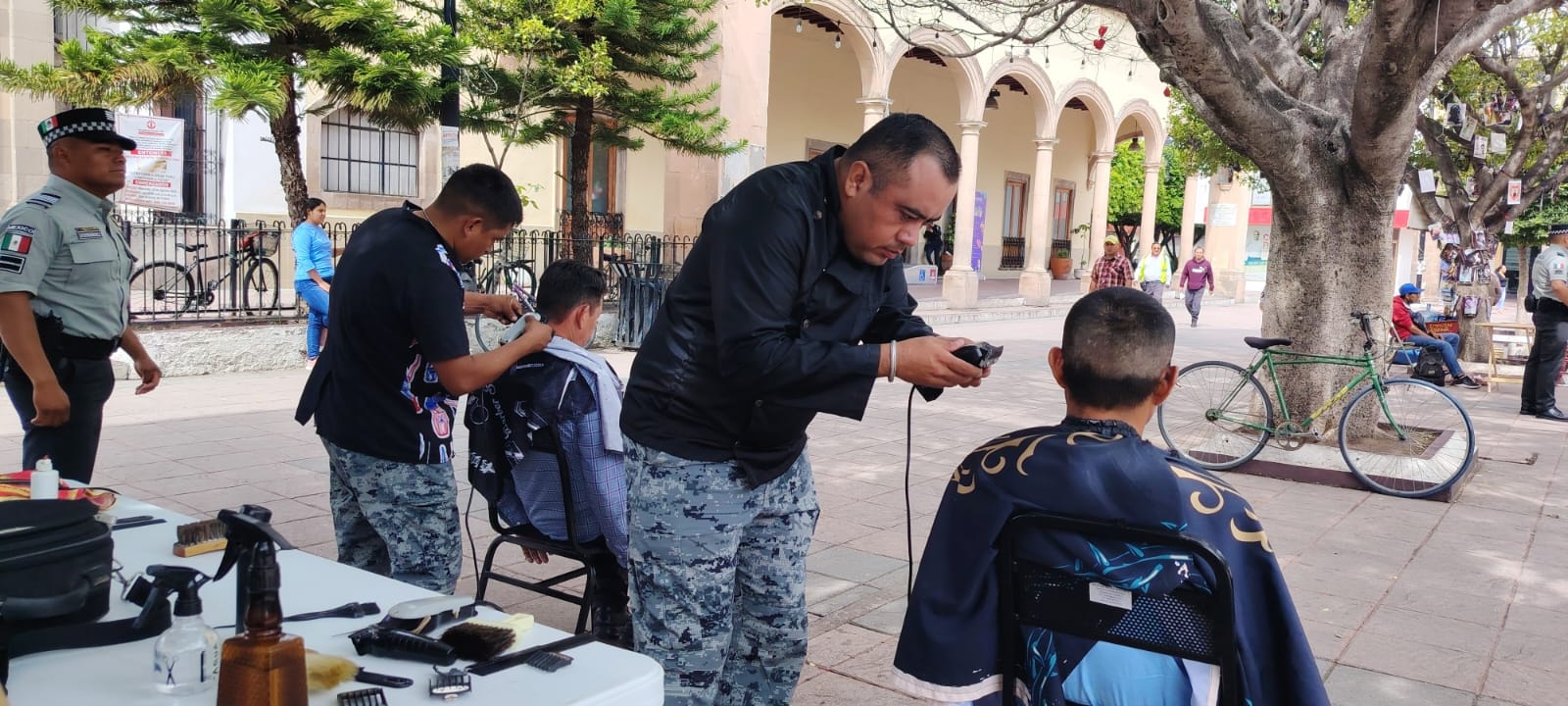 Efectivos de la Guardia Nacional brindaron proximidad y servicio en el Jardín Principal de Salamanca, Guanajuato, ofreciendo atención médica básica y cortes de cabello gratuitos a la población.