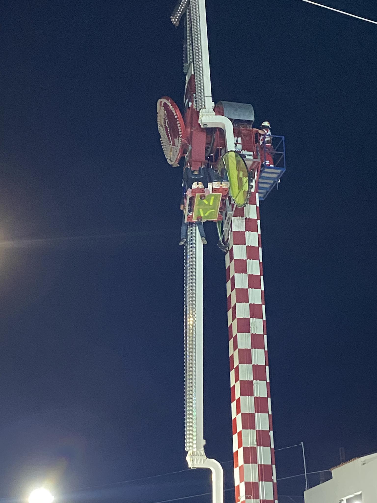 La noche de este pasado domingo, un brazo del juego mecánico llamado “Booster” se rompió en la Feria  patronal de San Miguel Arcángel, dejando a un hombre y una joven atrapados a varios metros de altura.