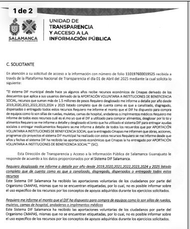 Sin embargo, en su respuesta oficial, el Sistema DIF Salamanca señaló que las aportaciones voluntarias recibidas por parte de los ciudadanos a través de CMAPAS “no se encuentran etiquetadas”, por lo que —según el documento— no es posible informar sobre el uso específico de los recursos por concepto de apoyos adquiridos durante los ejercicios solicitados.