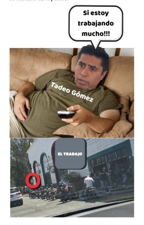 BRILLA… PERO POR SU AUSENCIA… Y es quehablando de ausencias y de flojeras, el que le anda haciendo la competencia duro y macizo al Presi Checharrín es el famoso Tadeo Gómez… y ustedes mis queridos 4 lectores se preguntarán… y ese quién es??? Bueno pues el jefe de tránsito, y resulta que pues… tampoco hace su chamba y solamente se limita a cobrar su jugosa quincena, y para muestra lo que pasa en casa, y me refiero oootra vez a las oficinas de la Leona Vicario, en las cuales literal se hace lo que a todo mundo de se la da gana, aunque sea ilegal… TOATAL!!! No hay autoridad, y es que ahora resulta que en el mero disco que dice que NO SE PUEDEN ESTACIONAR se convirtió en estacionamiento de motos, todo a la luz del día y con la complicidad de Tadeo Gómez, quien brilla por su ausencia en el pueblo.