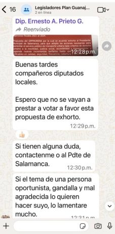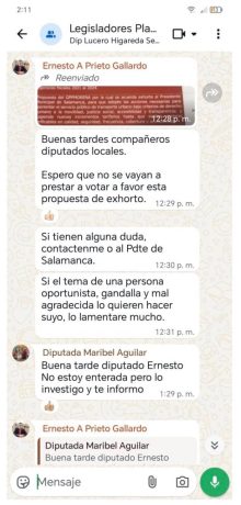 En capturas difundidas en redes sociales se observa un mensaje atribuido a Prieto Gallardo dirigido a legisladores locales, en el que solicita no respaldar la propuesta y cuestiona la postura de la diputada. La autenticidad, contexto y alcance de dichos mensajes forman parte del debate público y del análisis que, en su caso, realicen las autoridades correspondientes.